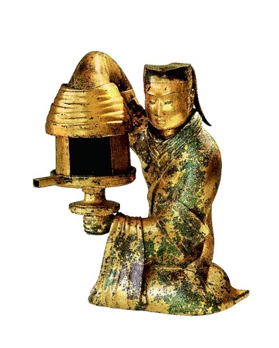 长信宫灯造型是一位跪地持灯的汉代年轻宫女,她梳发髻、覆巾帼,身穿广袖长衫,跣足跪坐,两臂之间托持一盏带罩铜灯,姿态恭谨而优雅。与其他青铜器物所展现出的神秘厚重不同,长信宫灯将汉代宫女的日常姿态定格在灯具之上,显得轻巧华丽,优雅灵动。